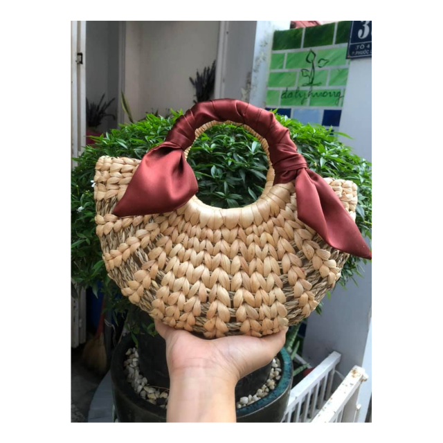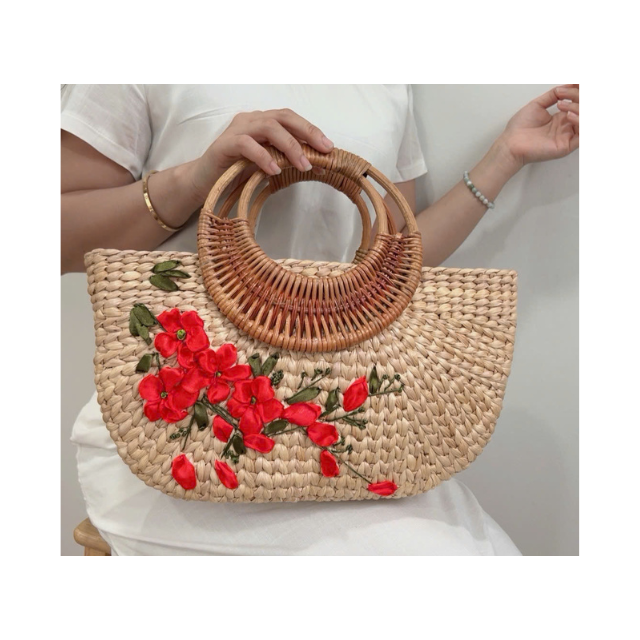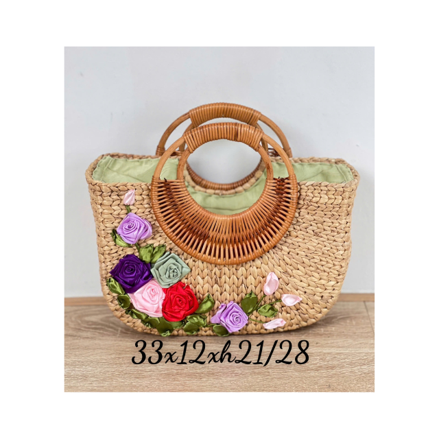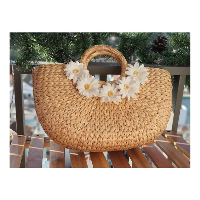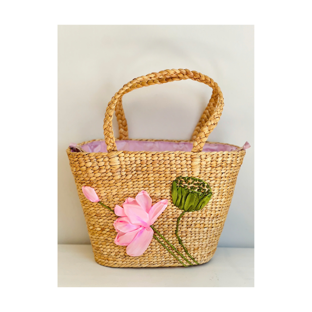 Handwoven Vietnam Water Hyacinth Beach Bag With Cotton Lining And Flower Embellishment Eco-Friendly Summer Shoulder Tote Bag