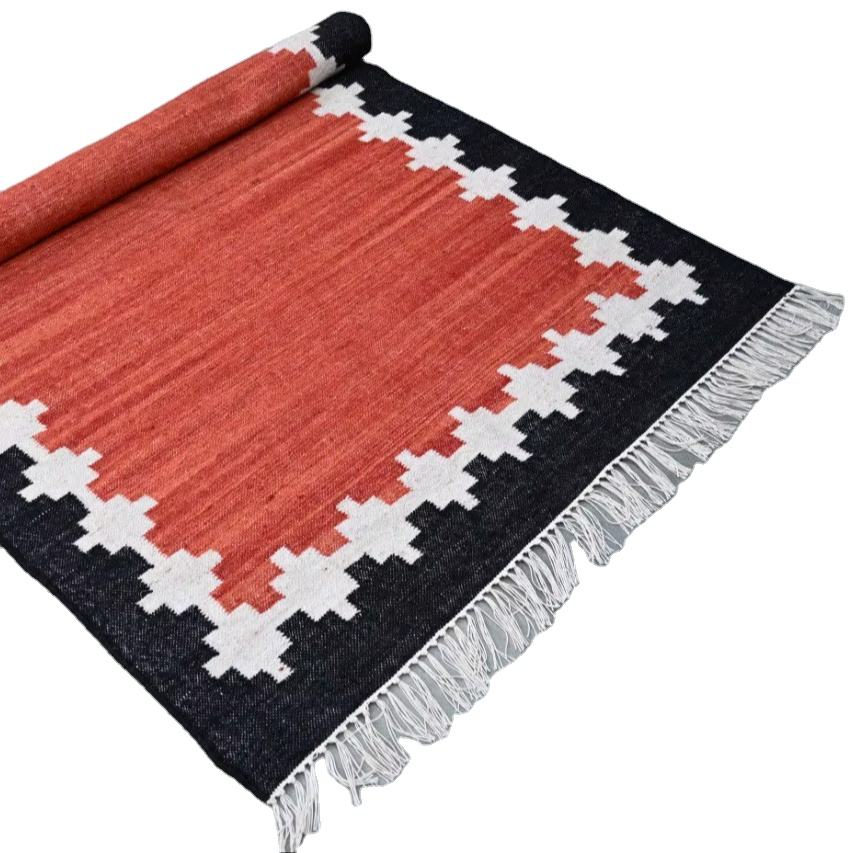 Handwoven Wool & Cotton Rug Black Brown Geometric Border Flatweave Reversible Washable Carpet Home Use