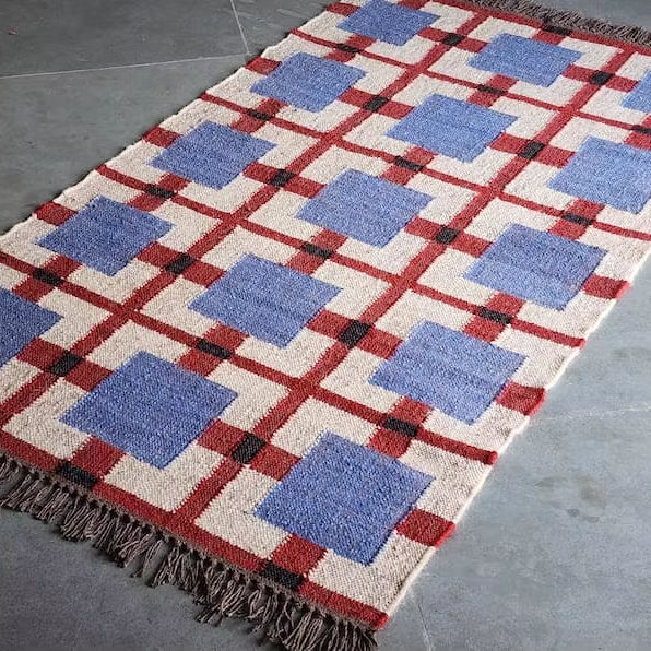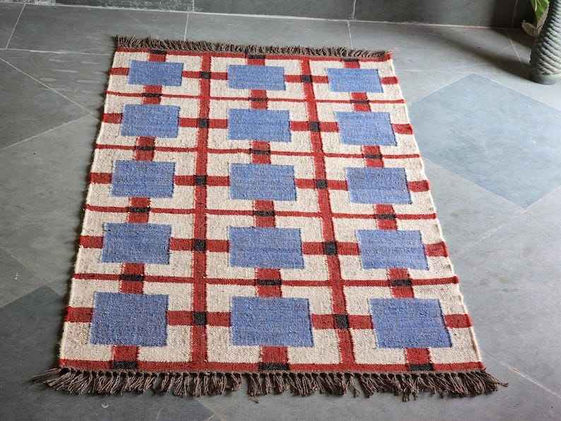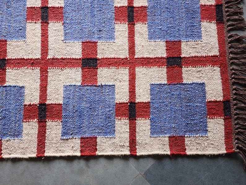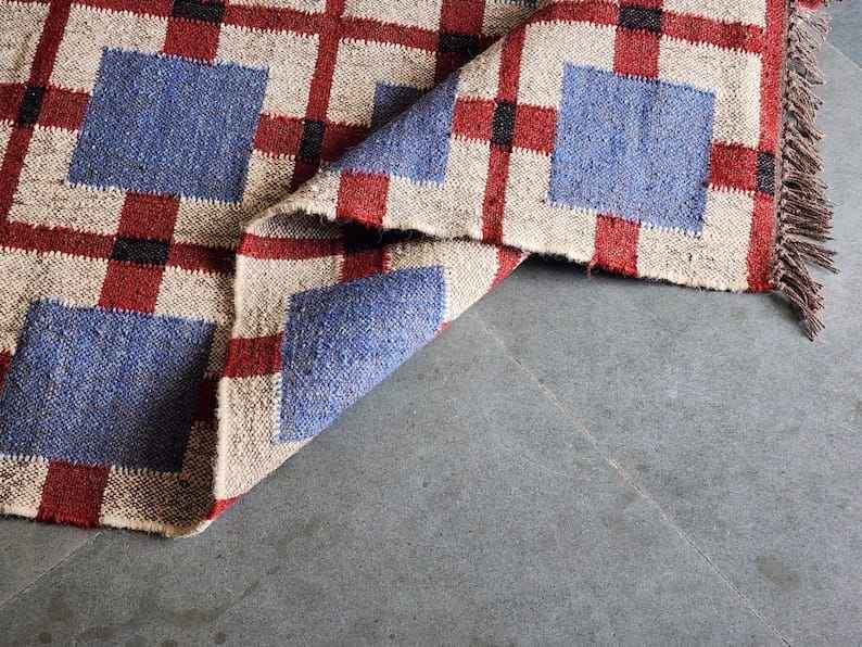 Handwoven Wool Kilim Rug, Blue Red Geometric Carpet, Boho Living Room Area Rug, Checkered Pattern Floor Mat, Modern Wool Dhurrie