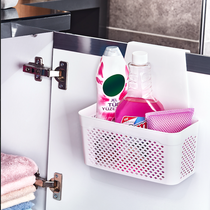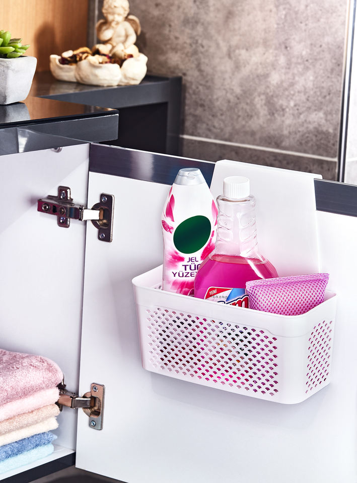 Hanging Cabinet Organizer Basket for Kitchen or Bathroom Storage Versatile Cabinet Bin with Handles for Cleaning Supplies