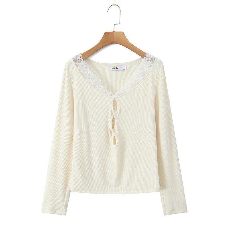 Happy Plus Knotted Lace V Neck Long Sleeve Top Black Plus Size Women's Blouse N9137