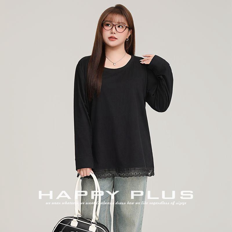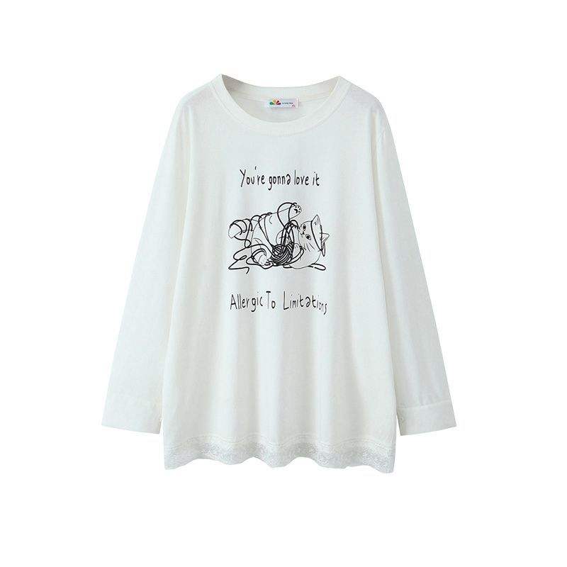 Happy Plus Lace Patchwork Loose Long Sleeve T-Shirt Women Plus Size Cartoon Print White Black Solid Color N9102