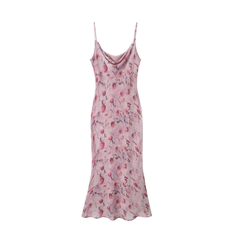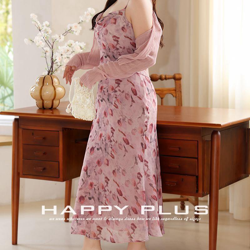 Happy Plus Plus Size Women's Floral Fishtail Slip Dress Natural Waist Sweetheart Neckline Pink Cardigan Included N8914
