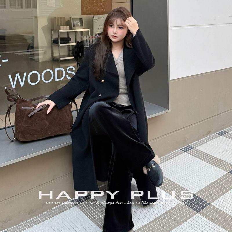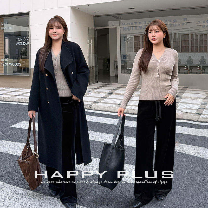Happy Plus V Neck Wool Knit Sweater Set Plus Size Oatmeal Top Black Pants Women's Solid Color Fitted Long Sleeve
