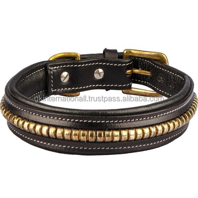 Havana Brown Top Quality Genuine Leather Full Padded Leather Dog Collar with Decorative Brass Finish Metal Clincher All Sizes