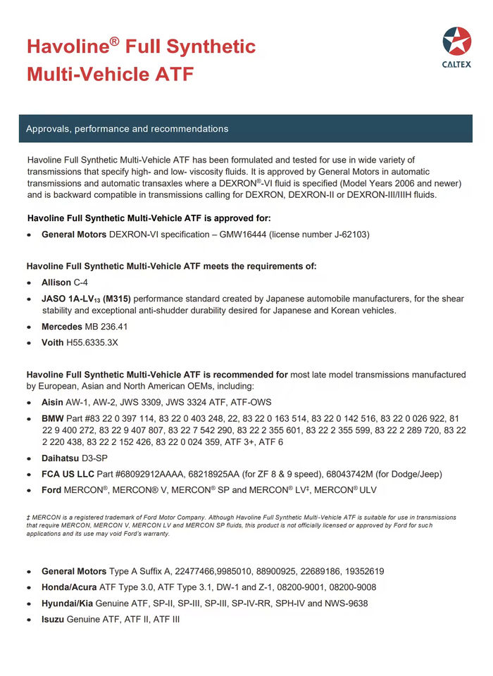 Havoline 14KG Plastic High Performance Fully Synthetic Multi-Vehicle ATF Smooth Shifting Engine Lubricants Cleaners for Thailand