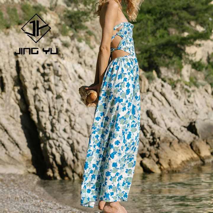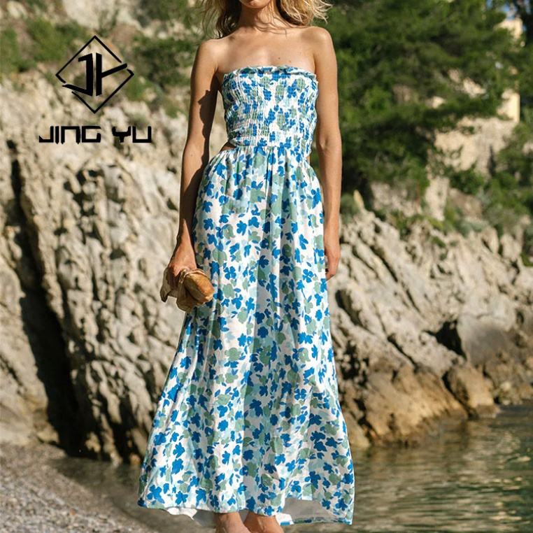 Hawaiian Maxi Dress Custom Printed Floral Strapless Hollow Design Casual Long Dress for Women