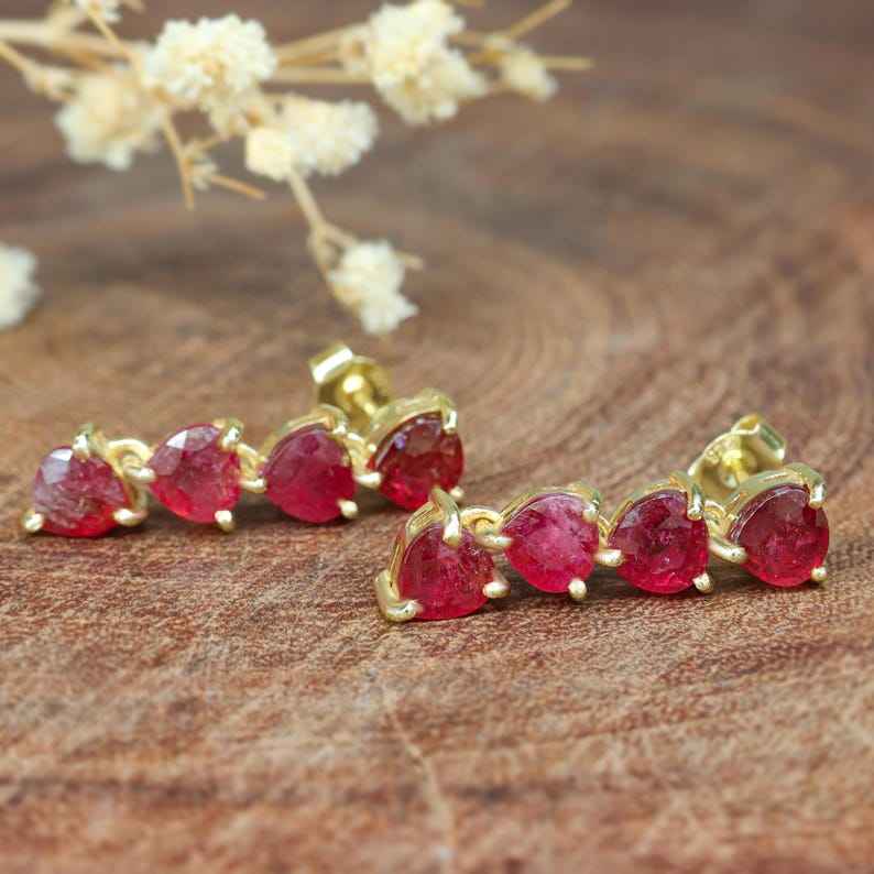 Heart Shape 4 Stone Ruby Earrings Stud And Dangle For Women Vintage Minimalist 925 Sterling Silver 14K Gold Plated