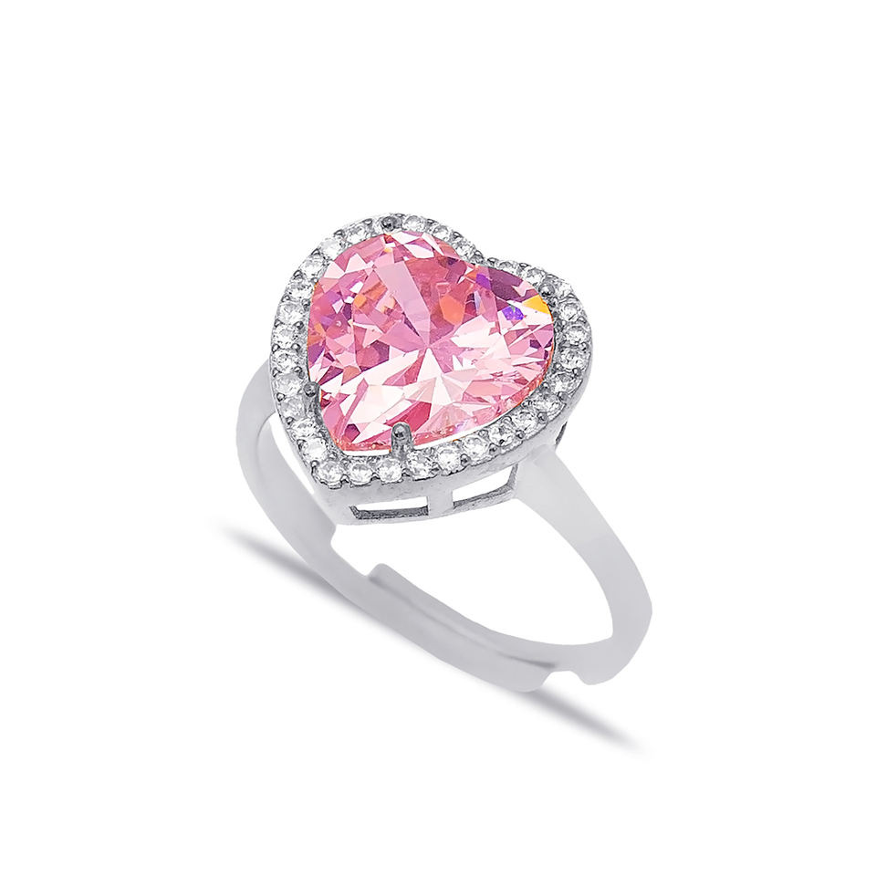 Heart Shape Heart Design Pink Zircon Stone with Zircon Stone Adjustable Ring 925 Sterling Silver Jewelry