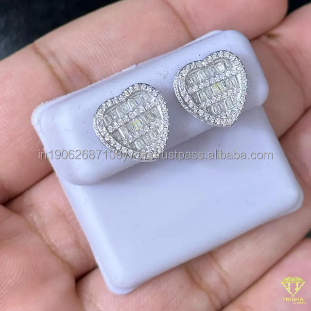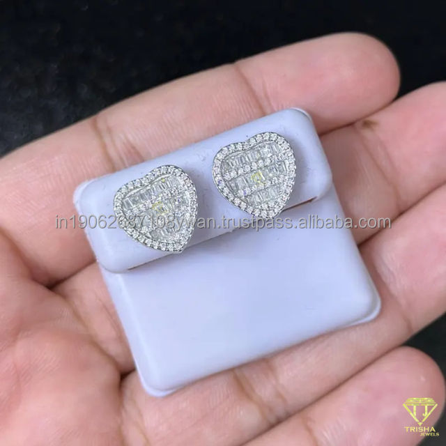 Heart Shape Iced Out Moissanite Diamond Studs Sparkling Baguette Heart Earrings with Freshwater Pearls GIA Certified