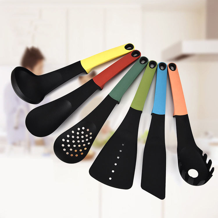 Heat Resistant Black Kitchen Cooking Tools 6 Pieces Standing Handle Nylon Kitchen Cooking Utensils Set with Holder