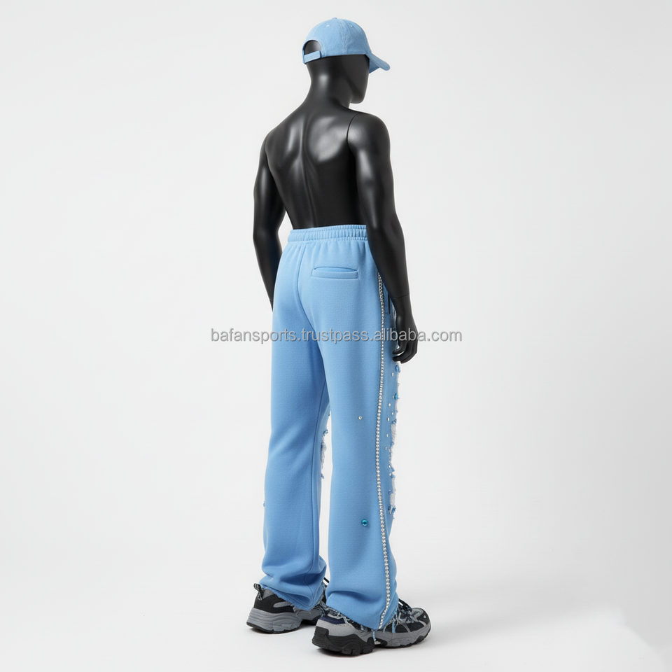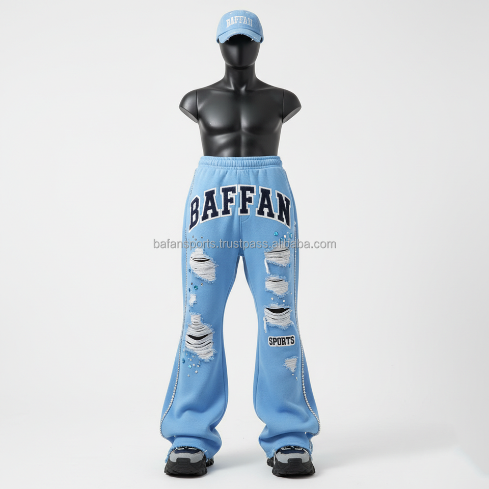 Heavy 340GSM Cotton Fleece Joggers Light Blue Streetwear Fit Ripped Knee Style with Custom Chenille Patch washed men's pants