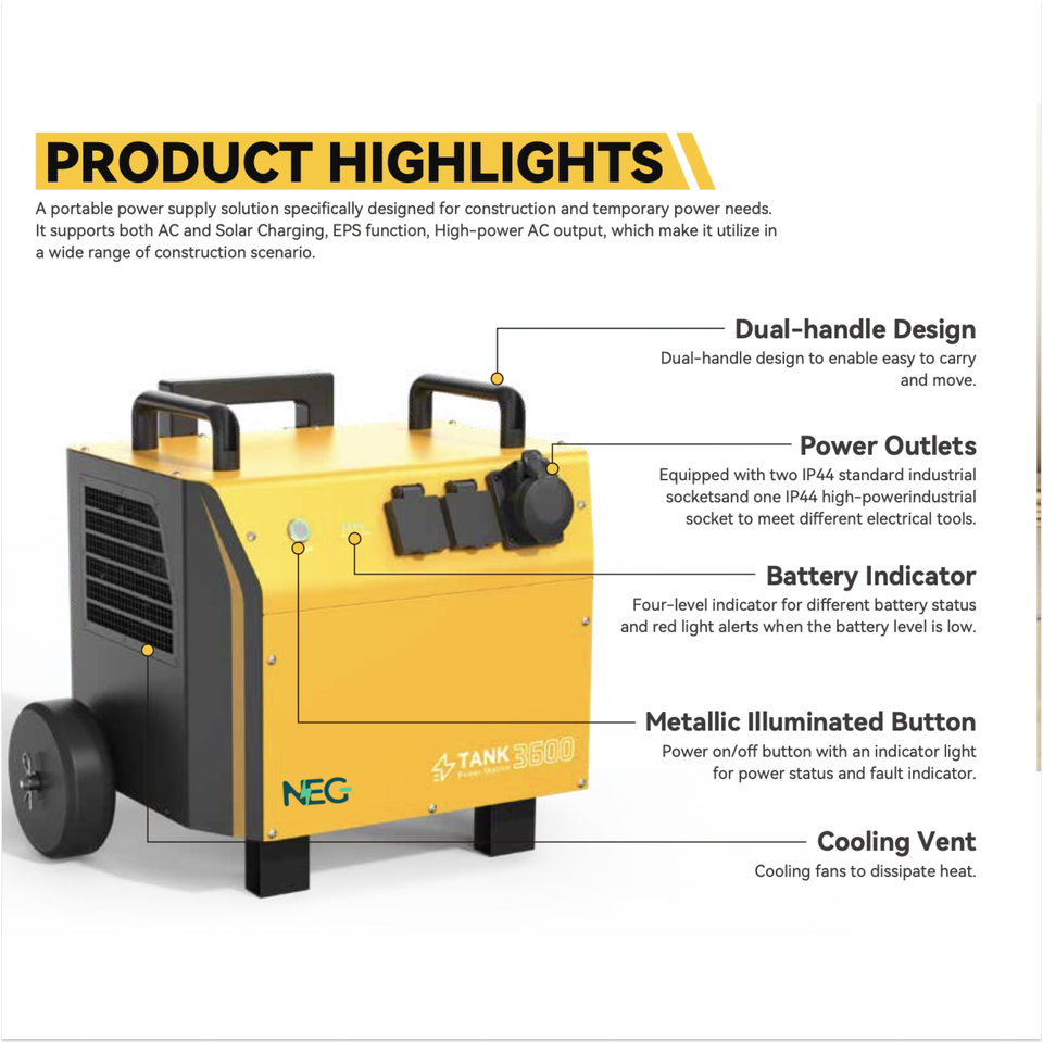 Heavy Duty 3600 NEG Tank Portable Solar Panel Power Station Fast Charging for Construction & Temporary Power Needs