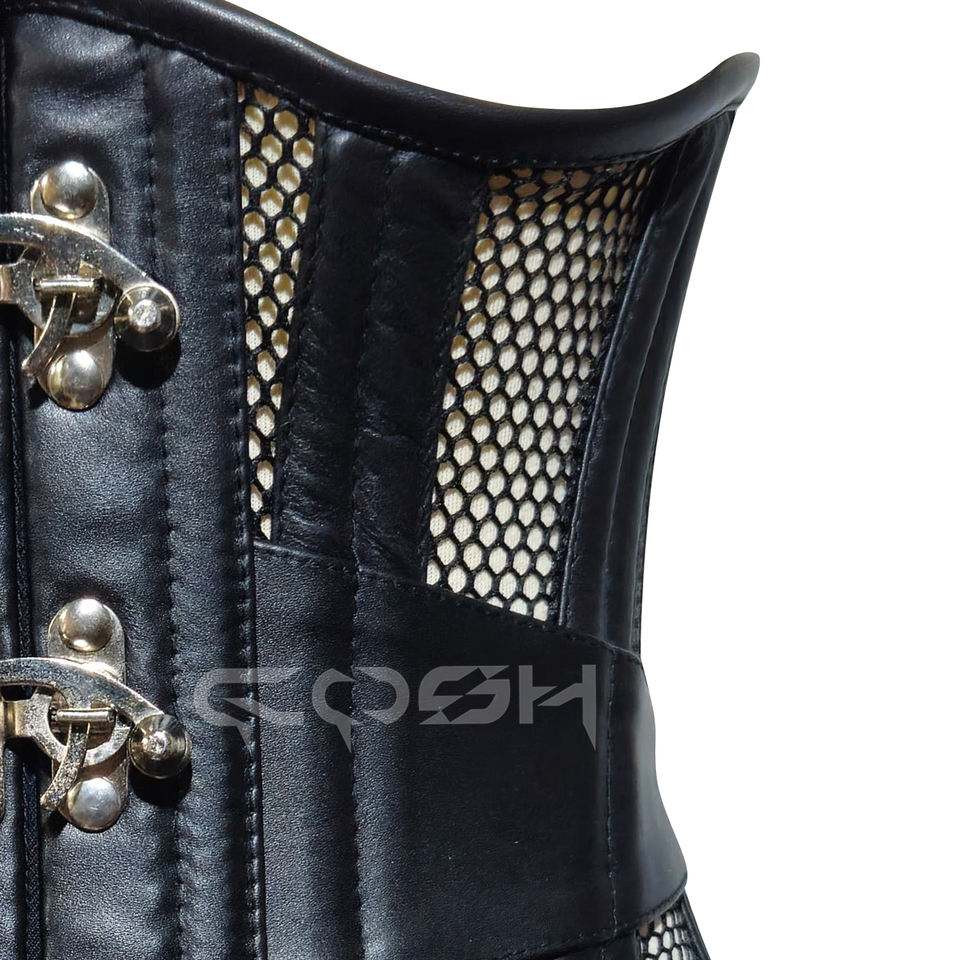 Heavy Duty Double Boned Underbust Black Leather With Mesh Waist Cincher Corset with Front Clasp Closure | Buy Now