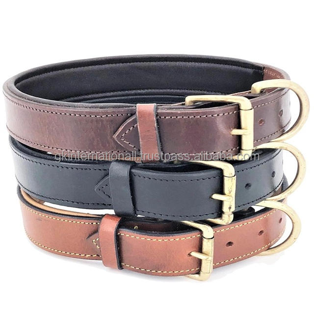 Heavy Duty Extra Wide Padded Leather Dog Collar for small medium or large dogs with adjustable Brass Buckle and D Ring