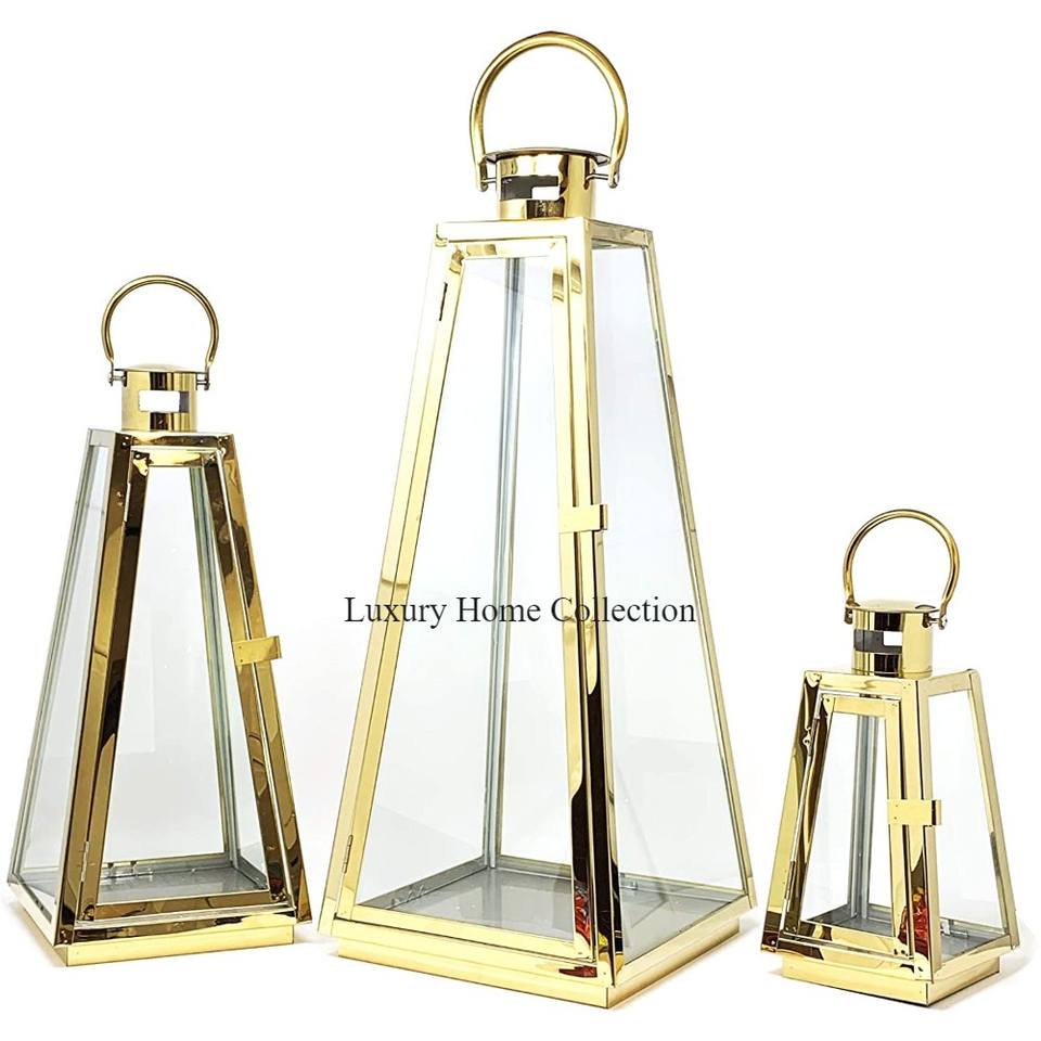 Heavy Duty Metal Decorative Candle Lantern Holder and Stand Gold Color Shiny Polish Attractive Look Lightning Decor Accessories
