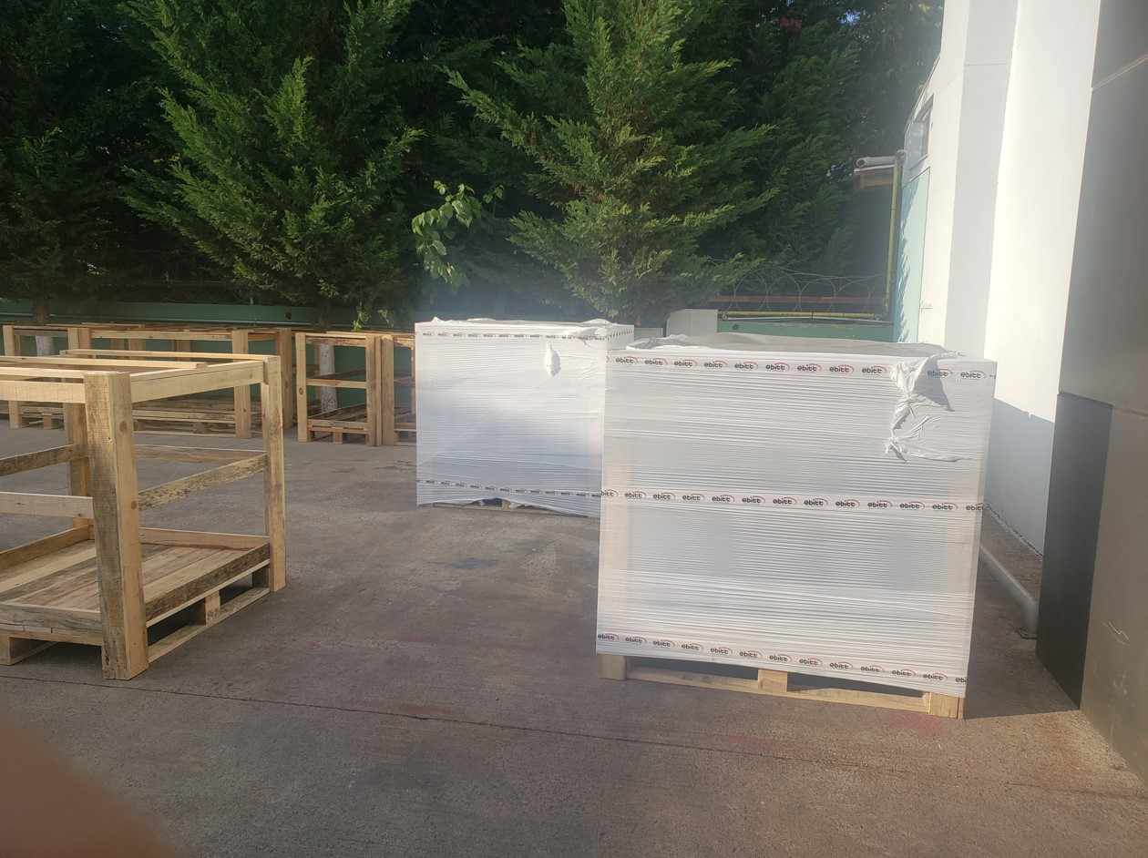 Staunch wooden box, covered against external factors with pallet. Weather resistant.