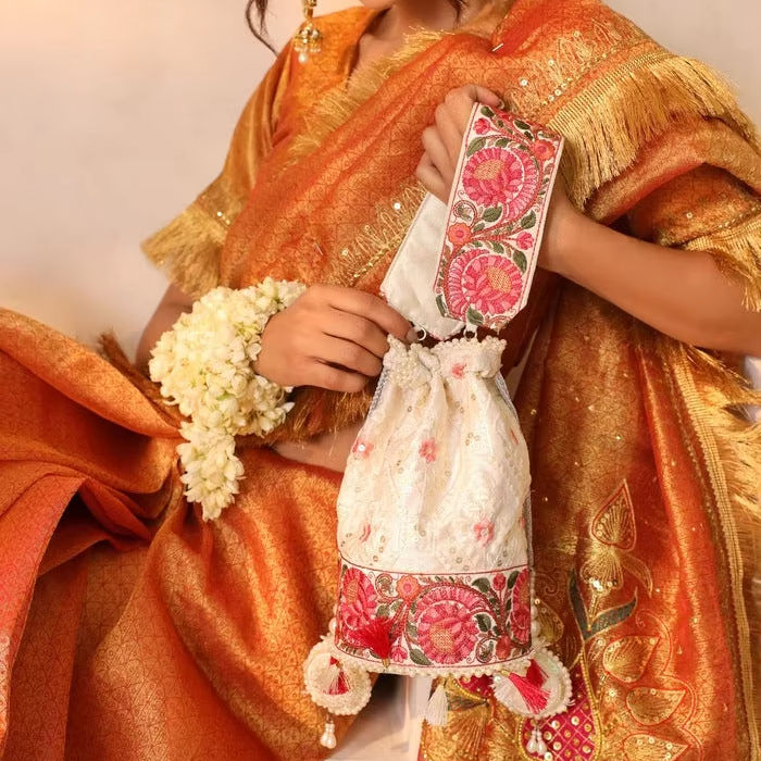 Heavy Embroidery Potli Bag with Hand Beads and Mirror Work for Indian Bridal Party Gift