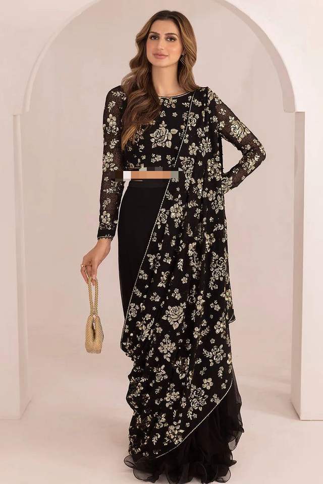 Heavy Faux Georgette Women's Designer Saree Suit Black Stylish Pleats Rhinestone Embroidery Handmade Pakistani Salwar Kameez