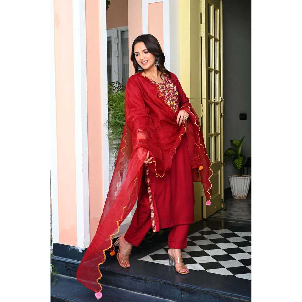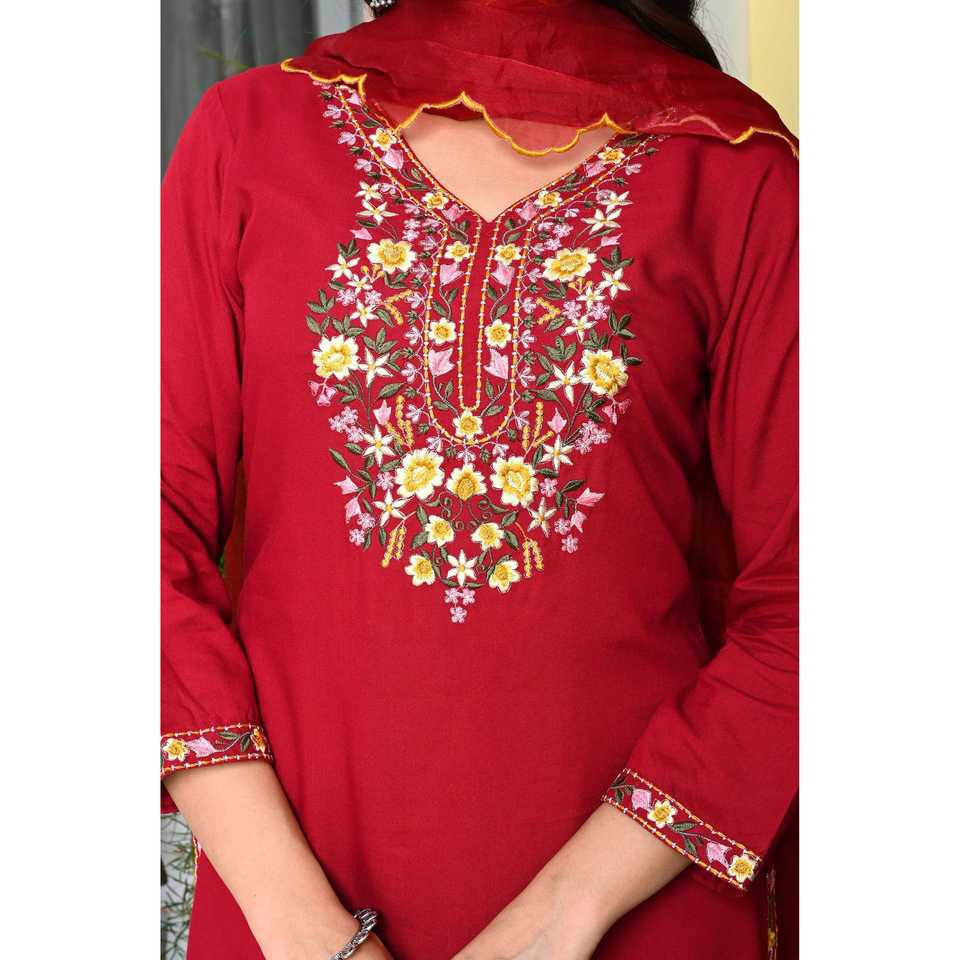 Heavy Floral Embroidered Red Rayon Kurta Set with Trousers & Organza Dupatta for Women