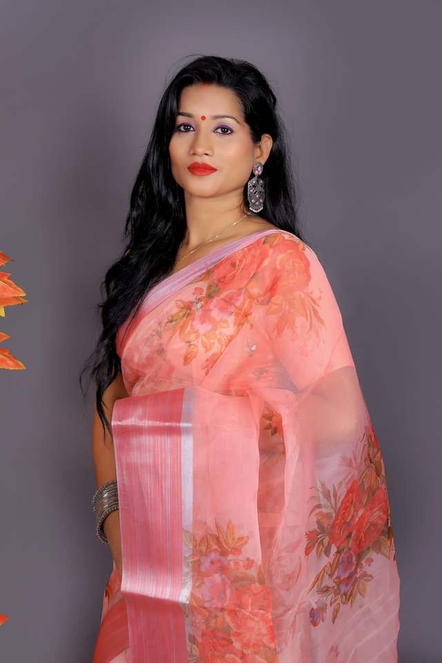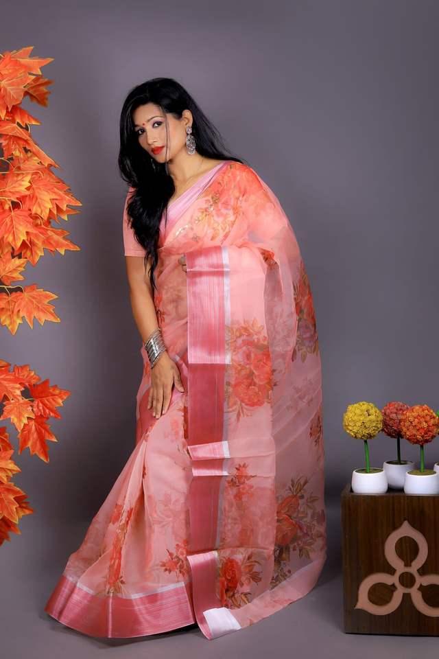 Heavy Organza Saree with White Floral Printed Work for Ladies