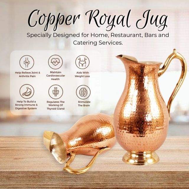 Heavy Quantity Sale Serveware Tabletop 1700ml Pure Copper Pitcher Jug Royal Mughlai Hammered Copper Jug Brass Handle Metal Jar