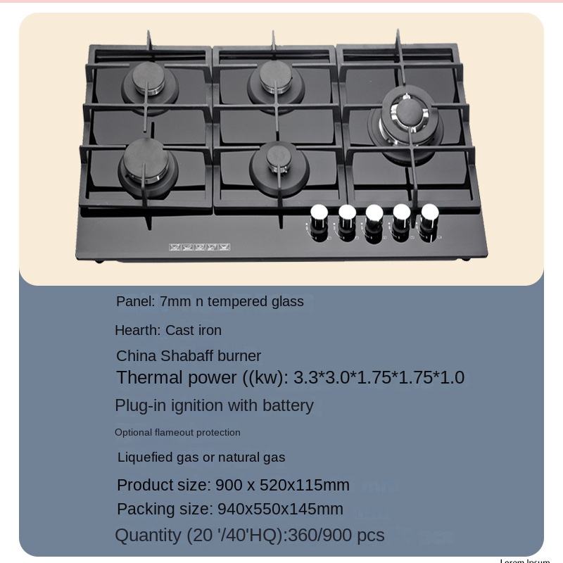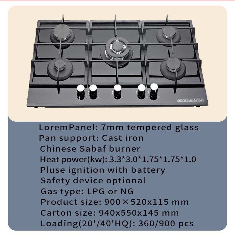 Heavy Cast Iron Support Gas Cooktop Dual Fuel 5 Sealed Burners Stovetop Tempered Glass Drop-In Gas Stove Gas Hob with Gas burner