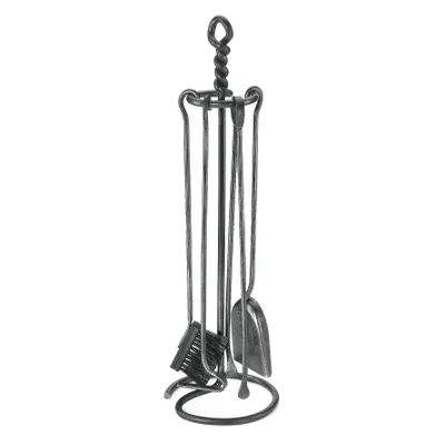 Heavy duty iron fire tools set with twisted design and long handles suitable for traditional or modern hearth setups