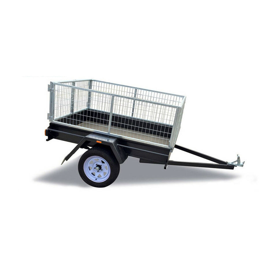 Heavy-duty tandem axle cage trailer with galvanized steel frame, reinforced flooring, and secure mesh sides for safe cargo trans
