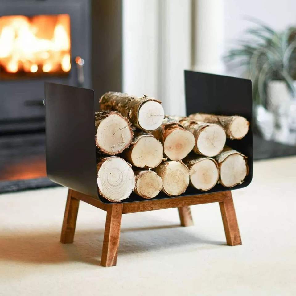 Heavy duty wrought iron log rack for storing firewood neatly beside indoor fireplace in a stylish rustic home decor