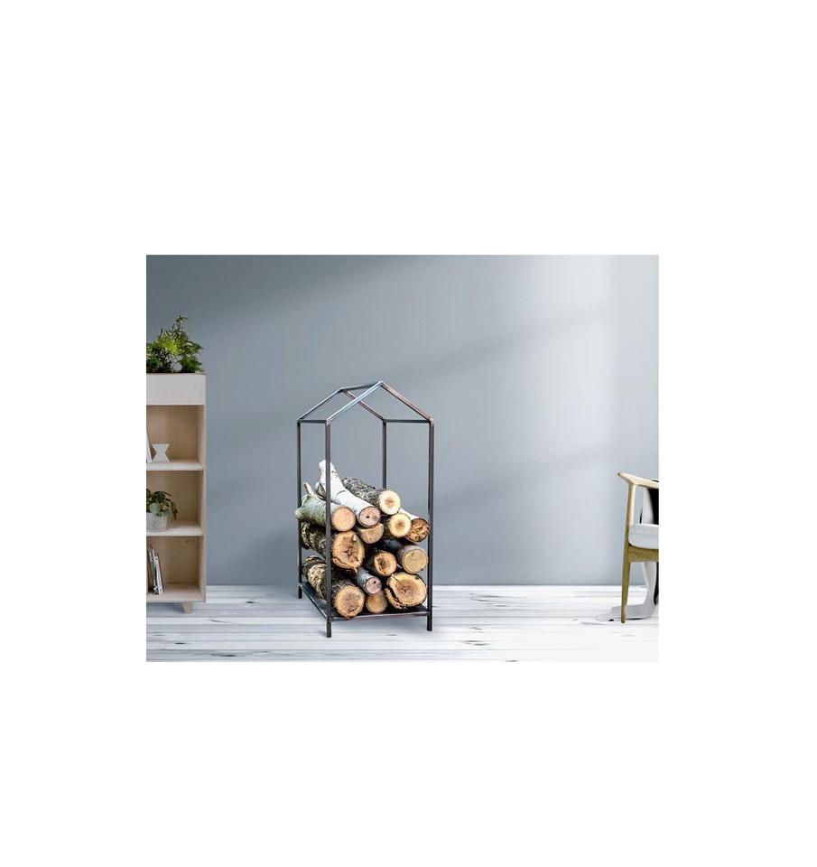 Heavy duty wrought iron log rack for storing firewood neatly beside indoor fireplace in a stylish rustic home decor