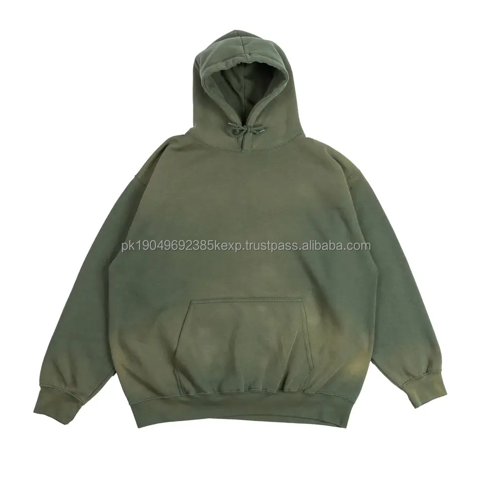 Heavyweight 14 Oz 100% Cotton French Terry Gradient Hoodies With Strings Green Color Embroidery Acid Washed Oversized Hoodie