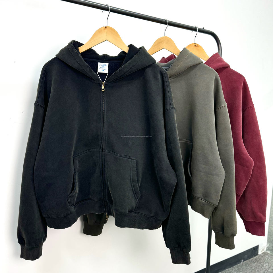 Heavyweight Custom Oversized Zip up Fleece Blank Streetwear Acid Wash Pullover Distressed Boxy Cropped Fit Hoodies for Men
