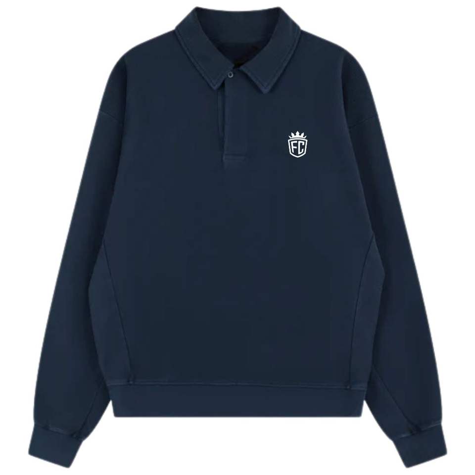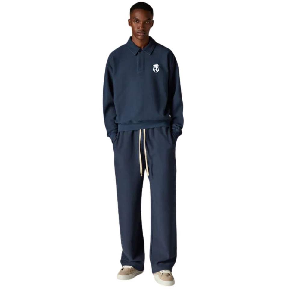 Heavyweight Navy Washed Ribbed Polo Sweatshirt and Jogger Set for Men Cotton Streetwear Sweatpants with Ribbed Collar Fashion