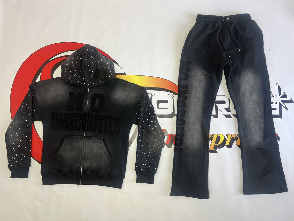 Heavyweight Puff Print Zip up Hoodie and Flared Sweatpants 100% Cotton Acid Wash Tracksuits for Men distressed embroidery