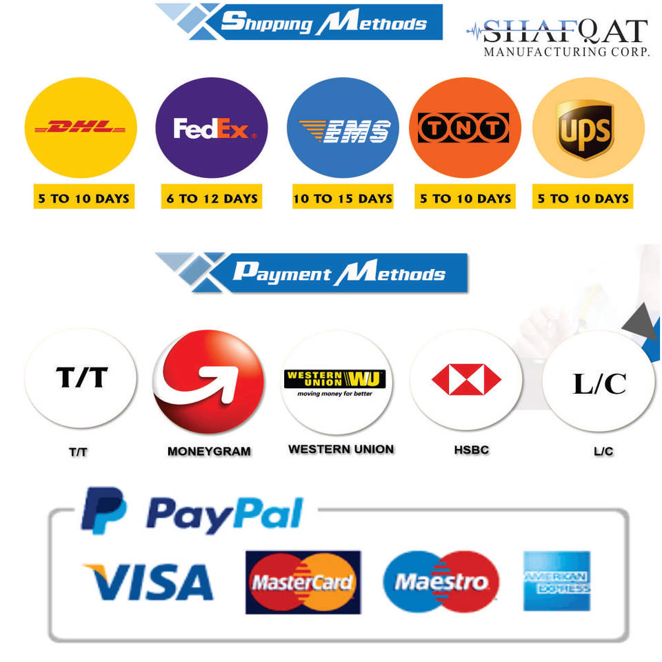 Paypal, Credit card, Master Card, TT Payment, CAD Payment, WU,