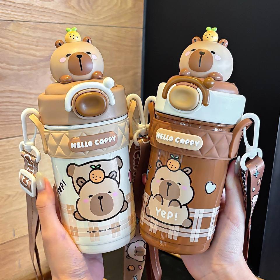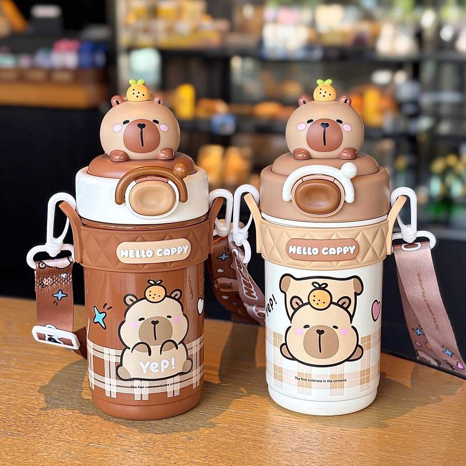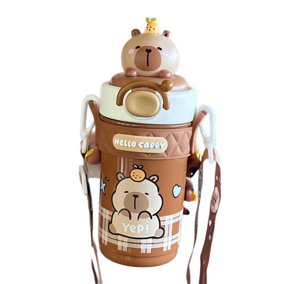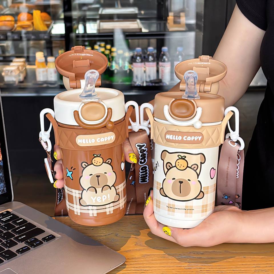 Hello Cappy Insulated Water Bottle For Students Brown And White Stainless Steel With Straw Back To School 2025