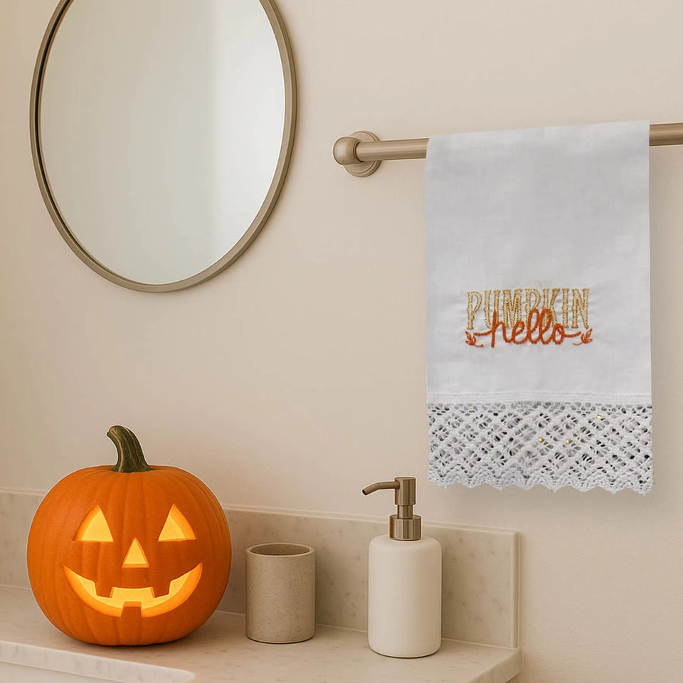 Hello Pumpkin Linen Guest Towel, Halloween Fall Hand Towel, Absorbent Linen Cotton Kitchen Bathroom Decor