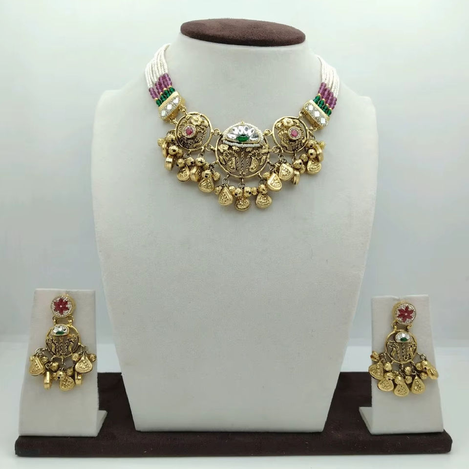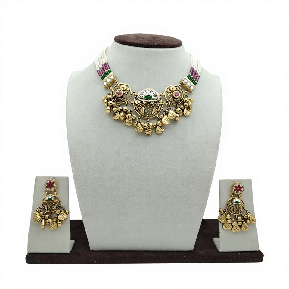 Heritage Silver Choker Necklace Set with Pearl Beads Gold Plated Traditional Pendant and Matching Earrings Wedding Wear
