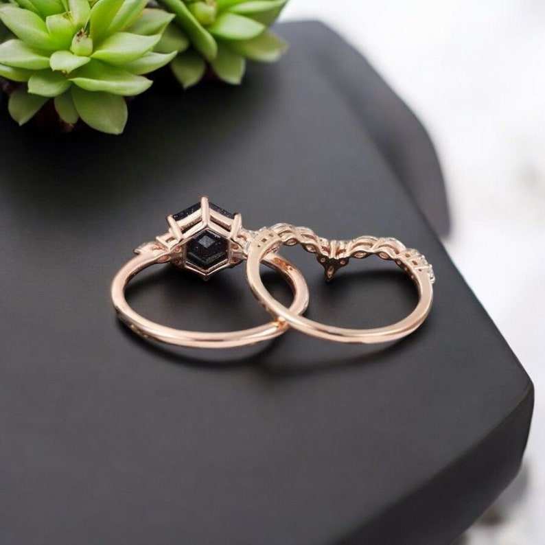 Hexagon Blue Sandstone Engagement Ring Set Moissanite Bridal Ring 925 Sterling Silver 14K Gold Plated Jewelry
