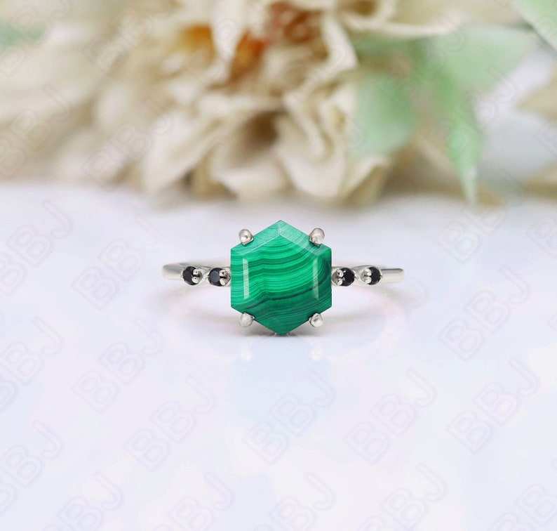 Hexagon Malachite Gemstone Ring 925 Silver 14K Rose Gold Plated Solitaire Engagement Promise Statement Ring Gift Jewelry