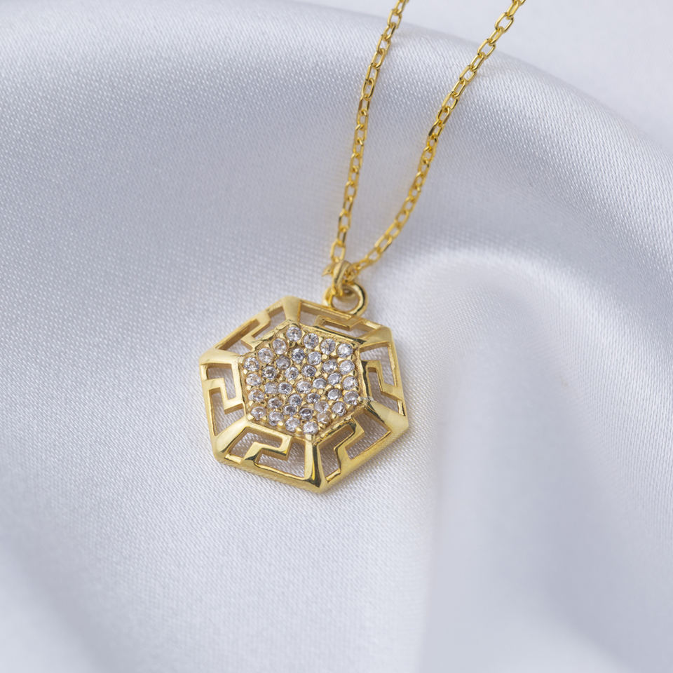Hexagon Shape Greek Motif Charm Necklace Turkish Wholesale 925 Sterling Silver Pendant