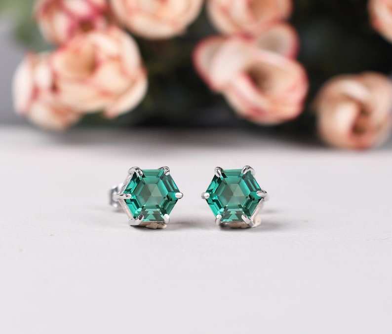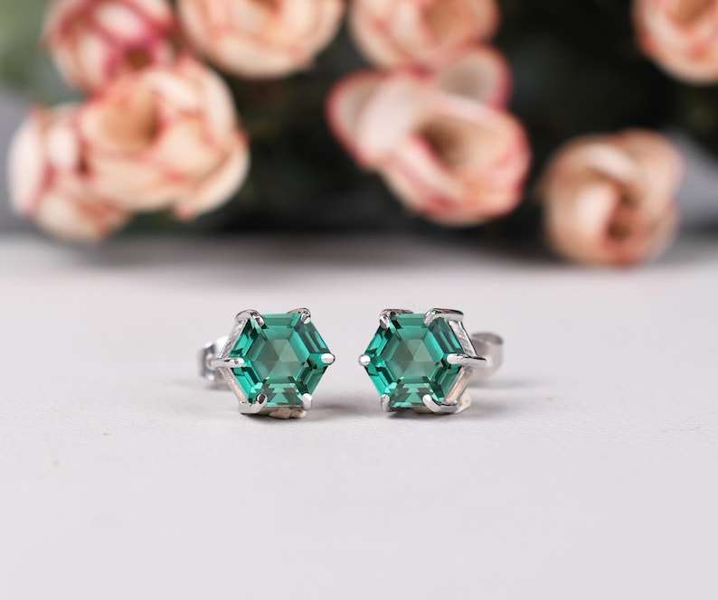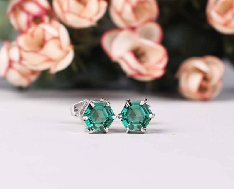 Hexagon Teal Sapphire Earring Studs Solitaire Birthstone Earring Women Jewelry Anniversary Gifts Teal Sapphire Stud Earrings