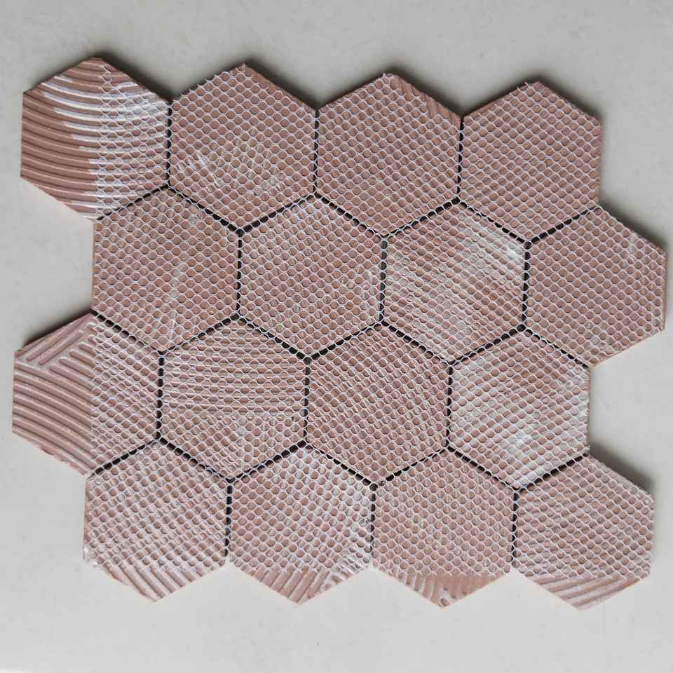 Hexagone 3-Inch 73mm Salmon Unique Metal Gold Stone Matte Glass Ceramics Mesh Porcelain Interior Wall Mosaics Modern Bathroom
