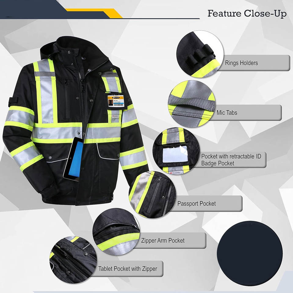 Hi-Vis Hooded Winter Safety Jacket Insulated Reflective Workwear Bomber Coat for Construction & Roadway
