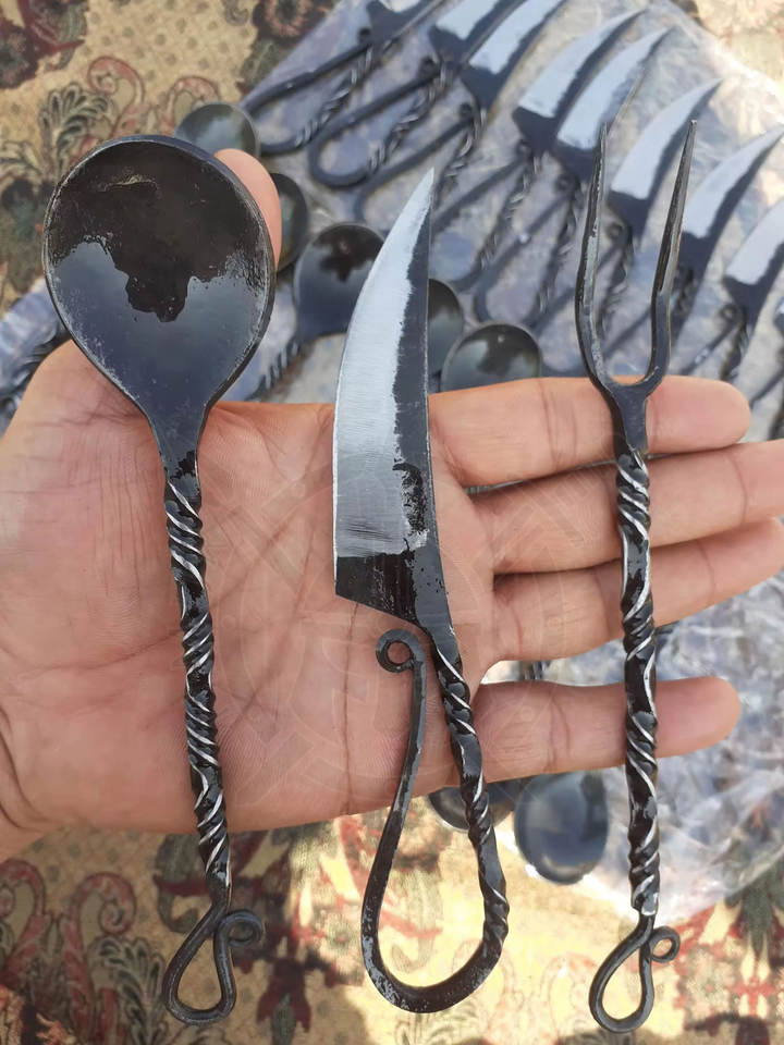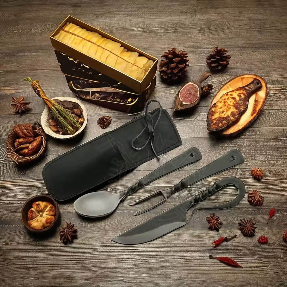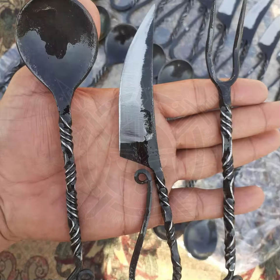 High Carbon Steel Hand Forged Eco Friendly Viking Style Medieval Cutlery Set with Custom Logo and Stainless Steel Handles