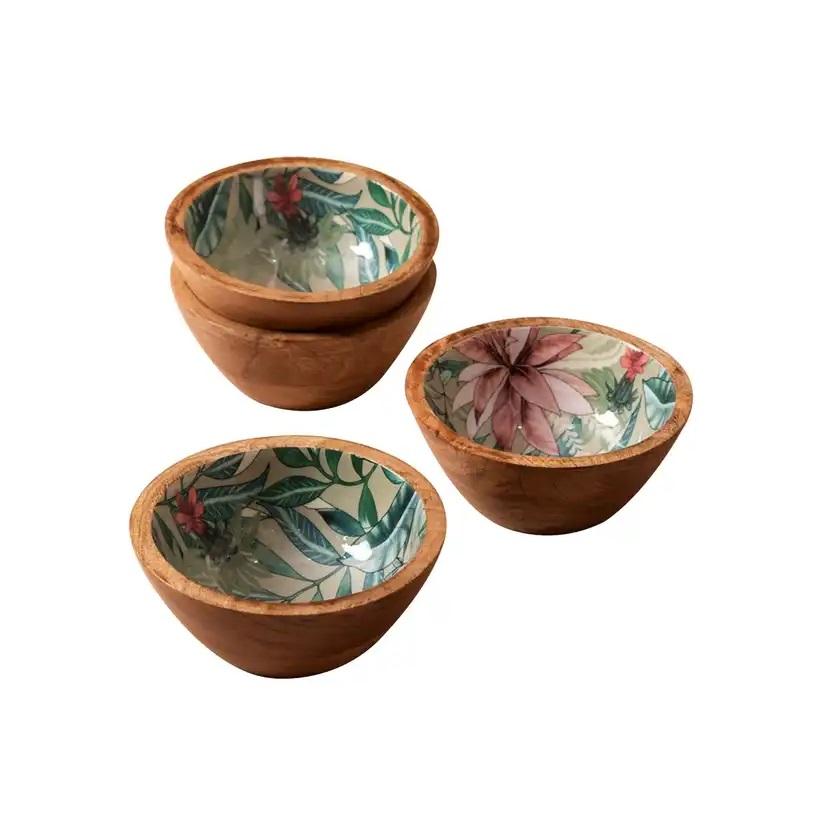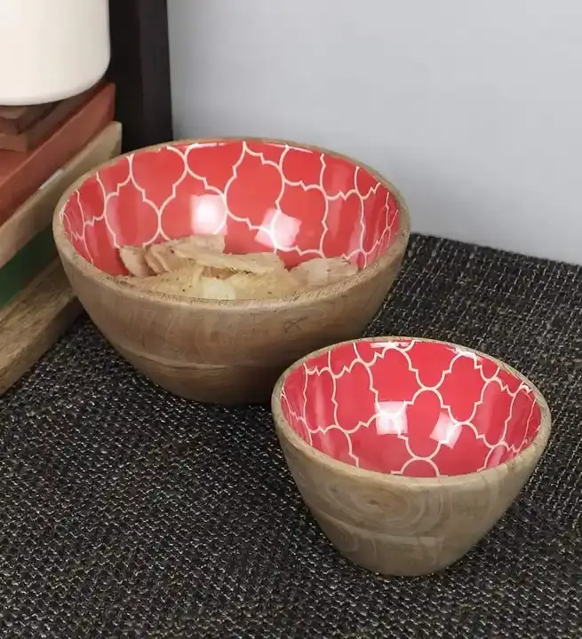 High-Demand Modern Decorative Mango Wood Salad Serving Bowl Set with Spoon and Digital Print for Hotels and Restaurants
