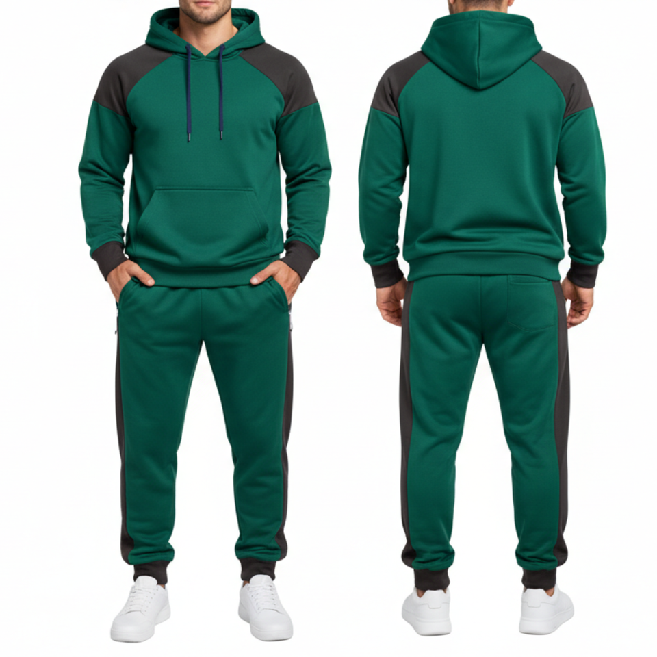 High Demand Mens dark green & dark grey Tracksuit – Raglan Sleeve Hoodie with Contrast Cuffs, matching trouser, Athletic Set