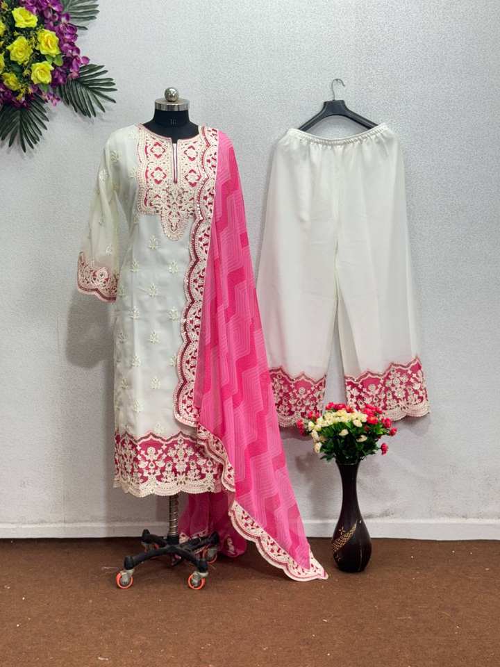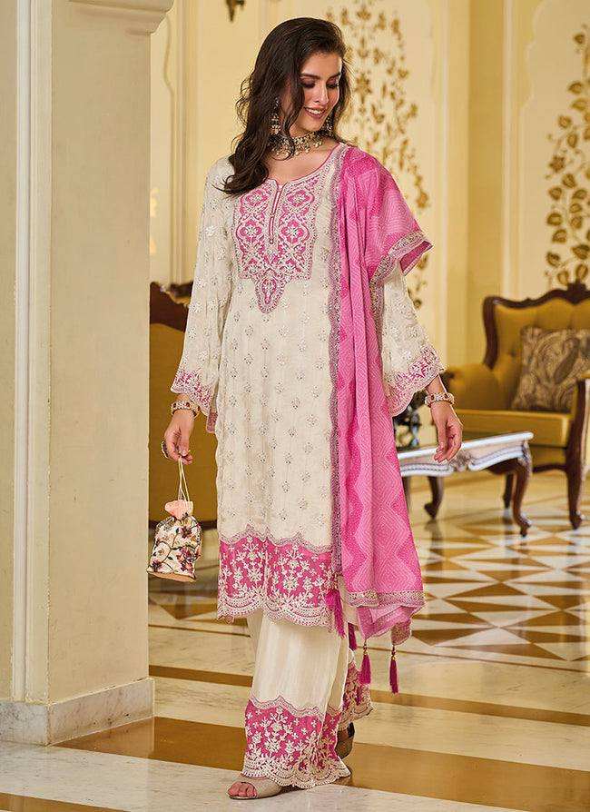 High-Demand Modern White Pink Salwar Suit for Indian Pakistani Women Faux Georgette Fabric with Embroidery Work
