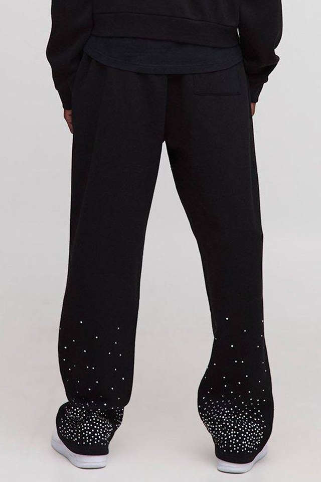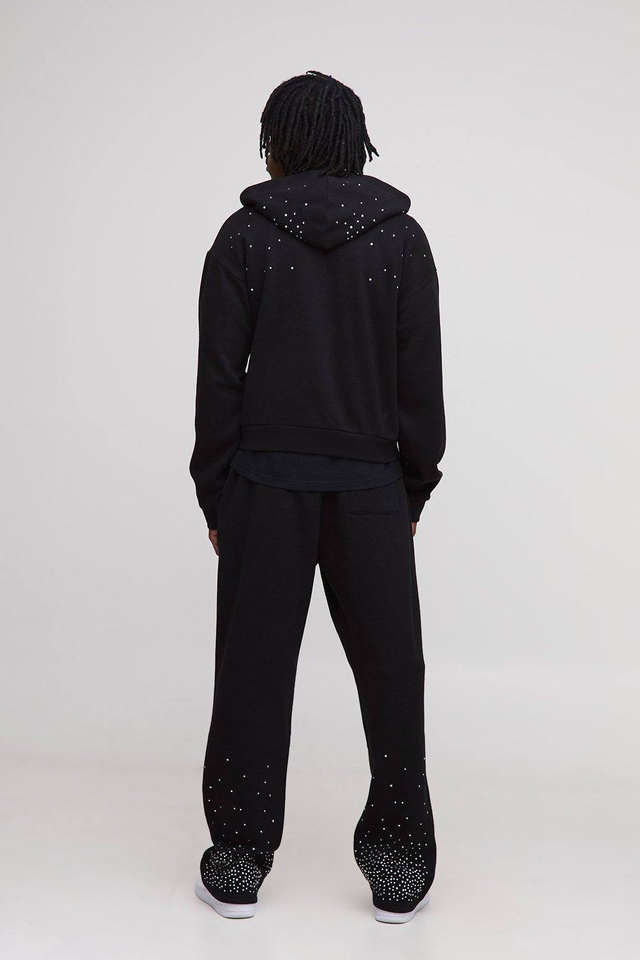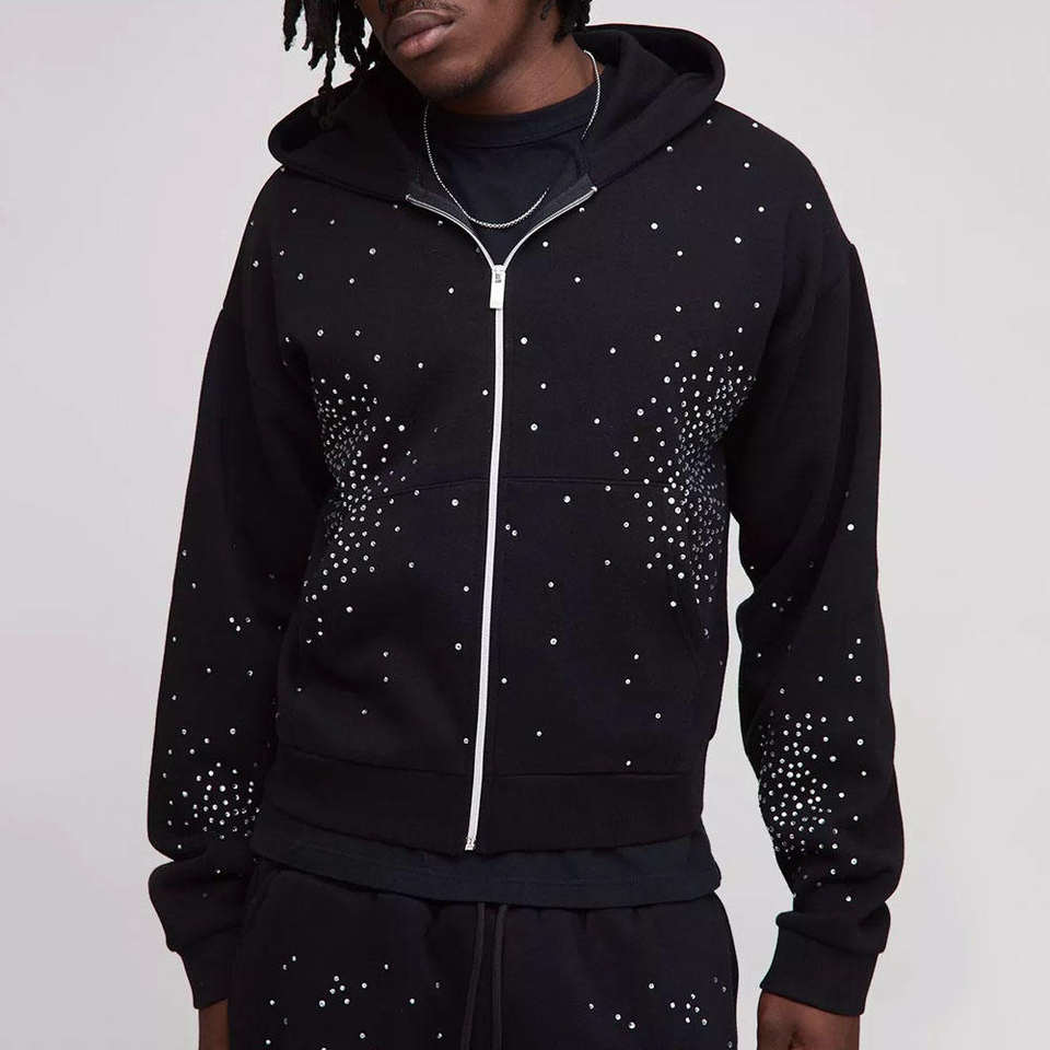 High Demanding Tall Shrunken Rhinestone Black Men Zip Hoodie & Jogger Set Breathable Cotton Blended Rhinestone Men Tracksuit